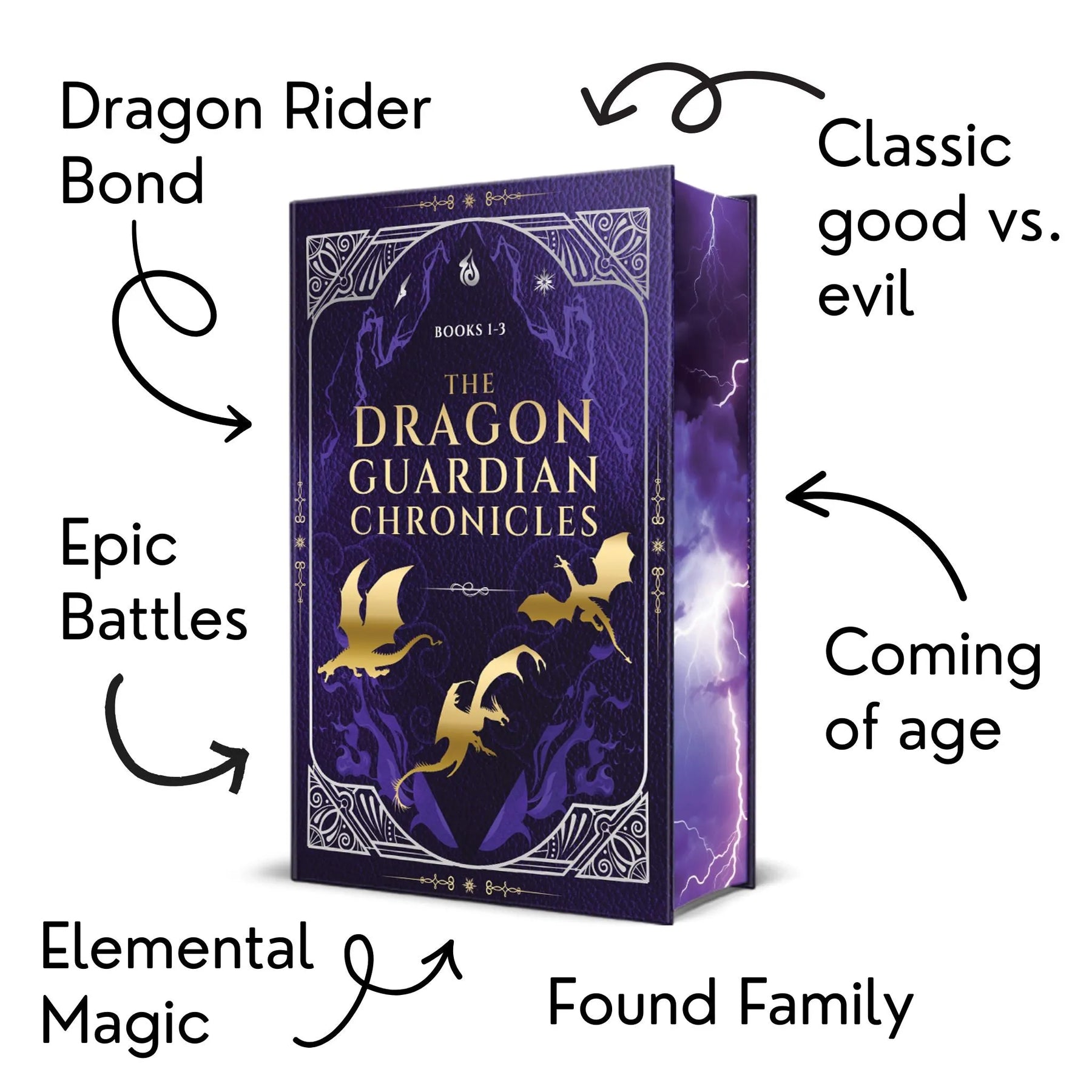 Book set titled 'The Dragon Guardian Chronicles' with purple and gold design. The back reads "A world split by storm, frost, and fire. A young mage on the run, hunted by Shadow Knights, and carrying a stolen dragon..."