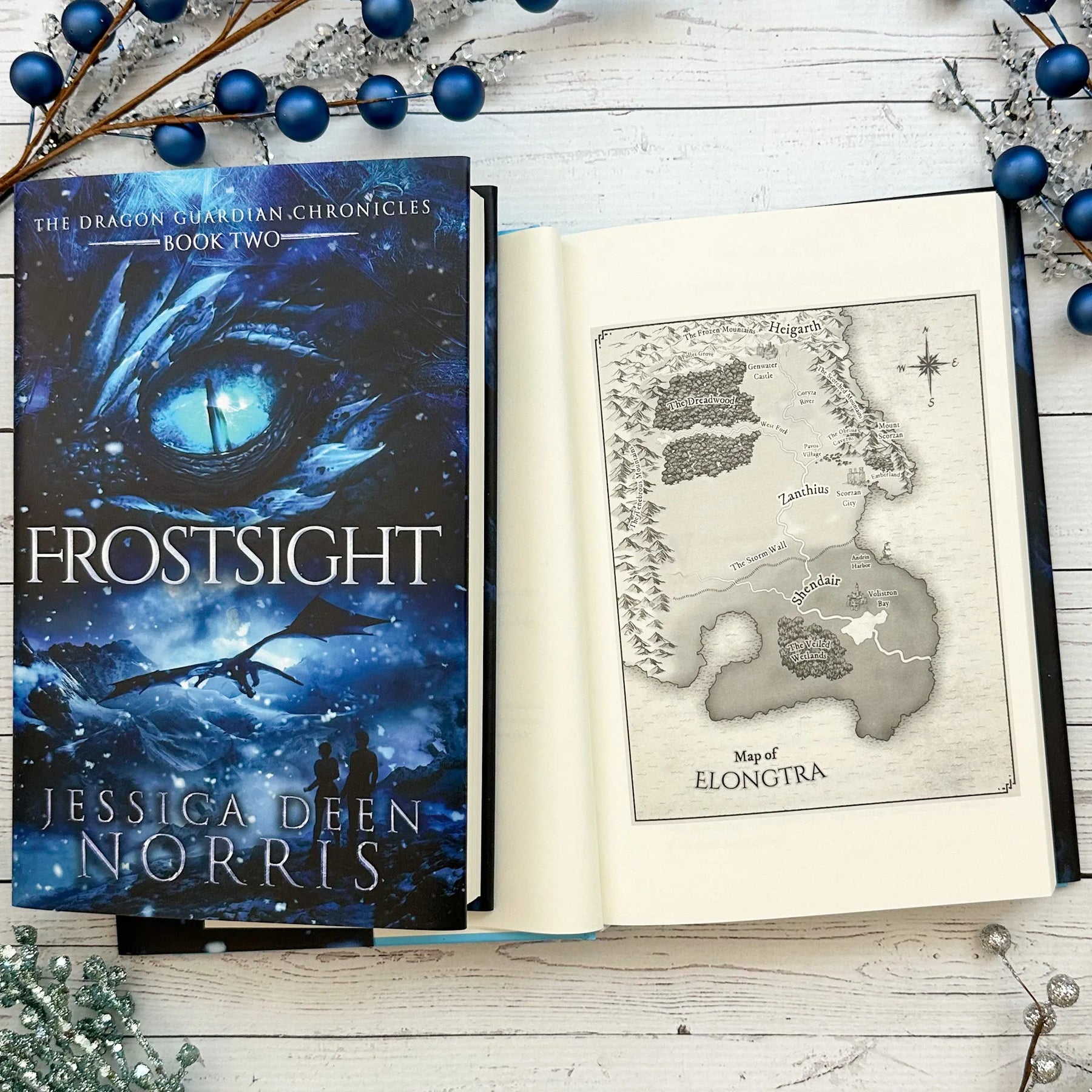 Frostsight book cover and another copy open to the map of Elongtra#autograph-option_signed-by-author