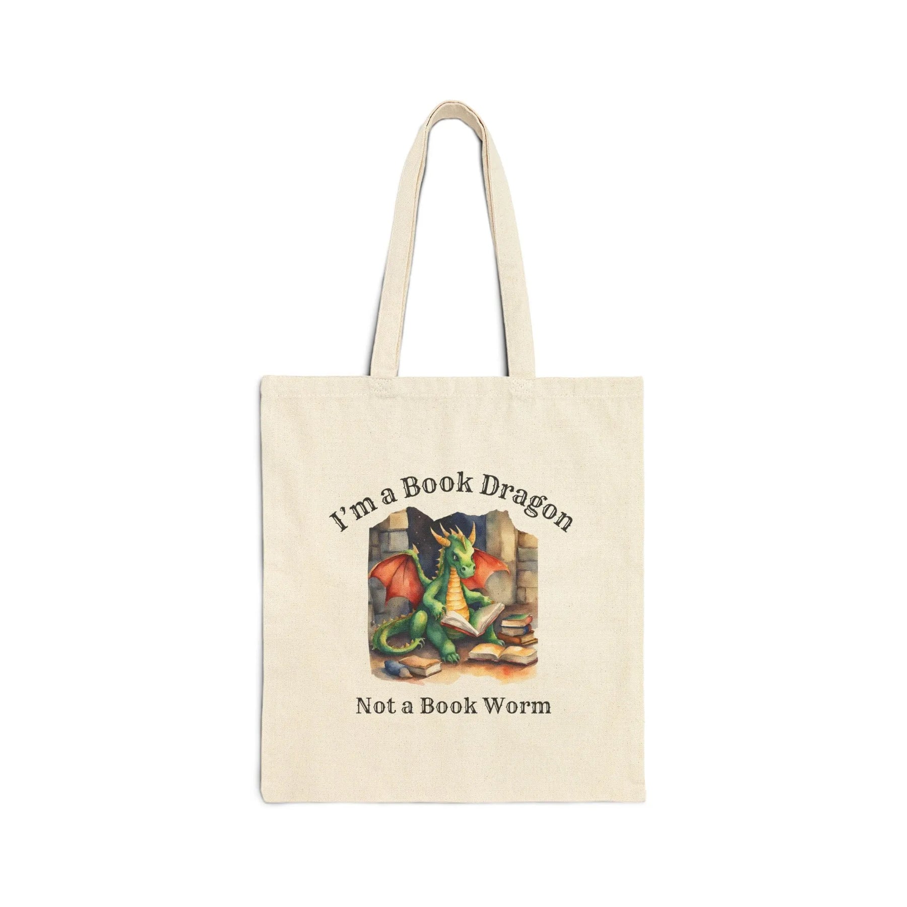 A canvas tote bag. Design on the bag reads "I'm a book dragon not a book worm." Between the text is a watercolor design of a dragon reading next to a stack of books.