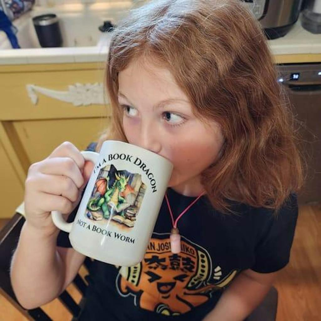 A white mug sitting on a table. Design on the mug reads "I'm a book dragon not a book worm." Between the text is a watercolor design of a dragon reading next to a stack of books.